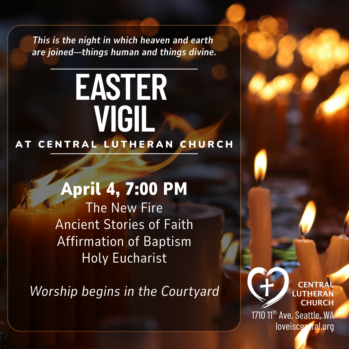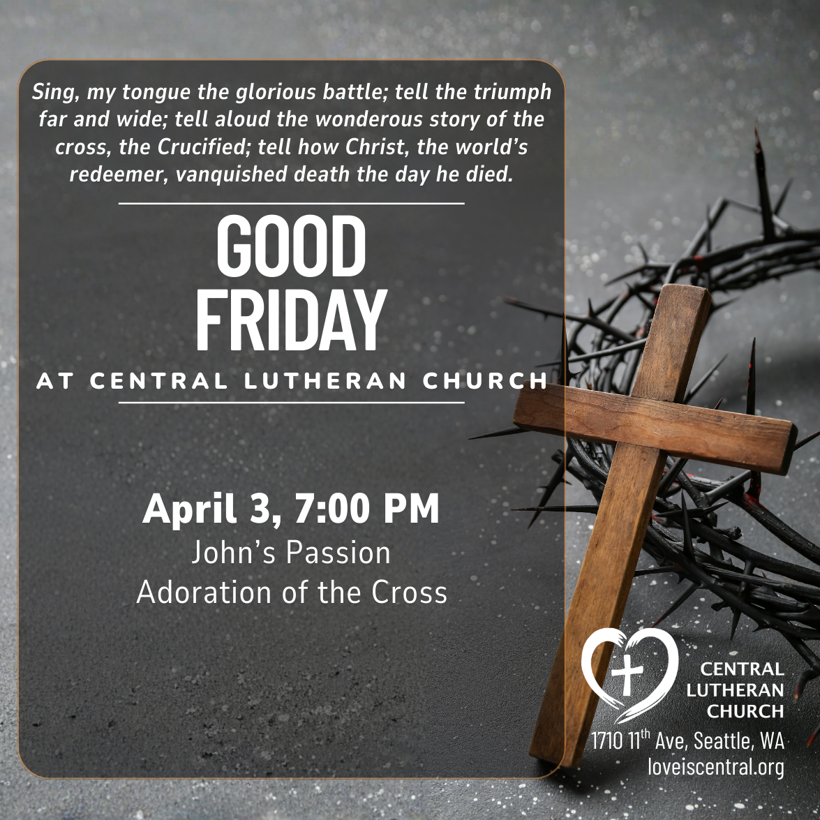On this night we remember how Jesus gathered his disciples around a meal we now call the Last Supper. We too will gather around a meal and move into a solemn worship service. “Maundy” comes from the Latin for “commandment,” and this night we recall Jesus’ commandment to love one another as we follow his example in washing each other’s feet and join his feast of life in Holy Communion. This service includes corporate confession, individual forgiveness, foot washing, and concludes with the stripping of the altar.